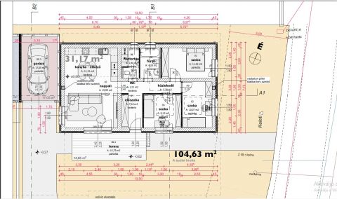 -420 m2-es telekrészen elhelyezkedő 80 m2-es lakóingatlan+ terasz,  17 m2-es fedett autóbeállóval